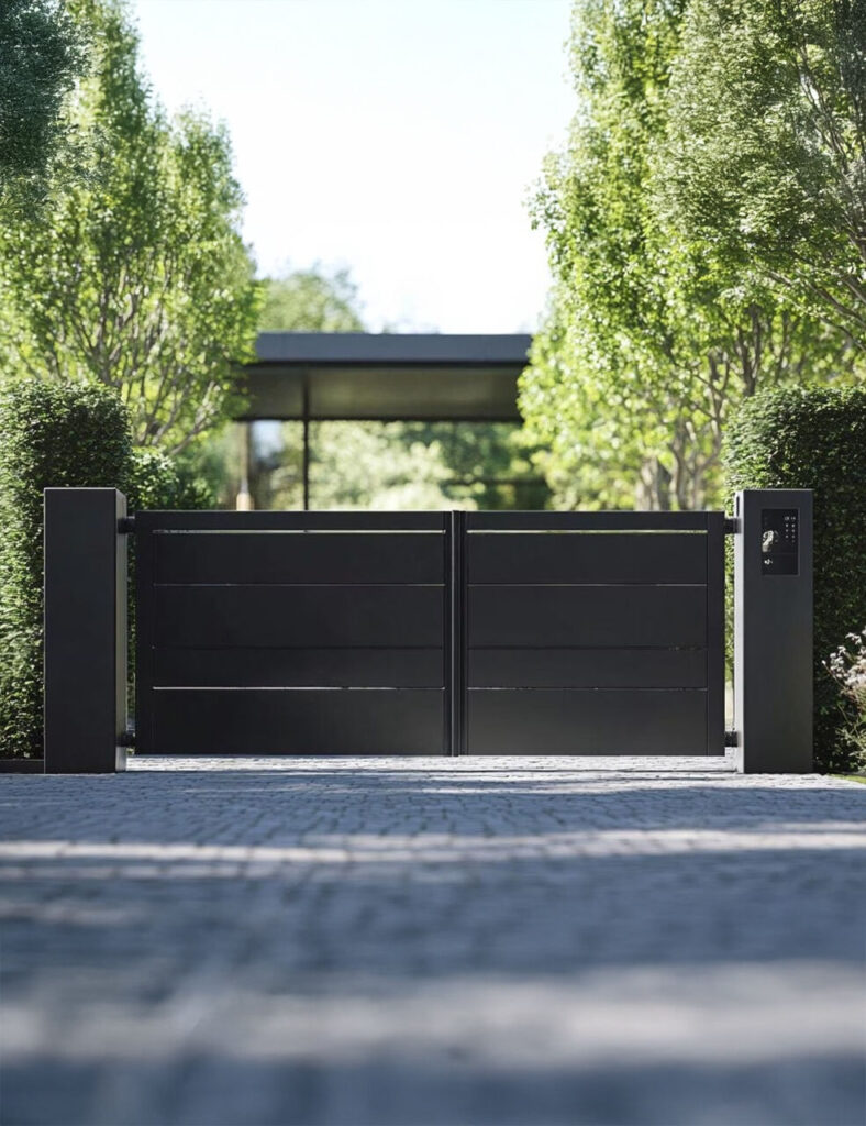 Onze tuinpoorten combineren een sterke aluminium structuur met hoogwaardige afwerkingen.